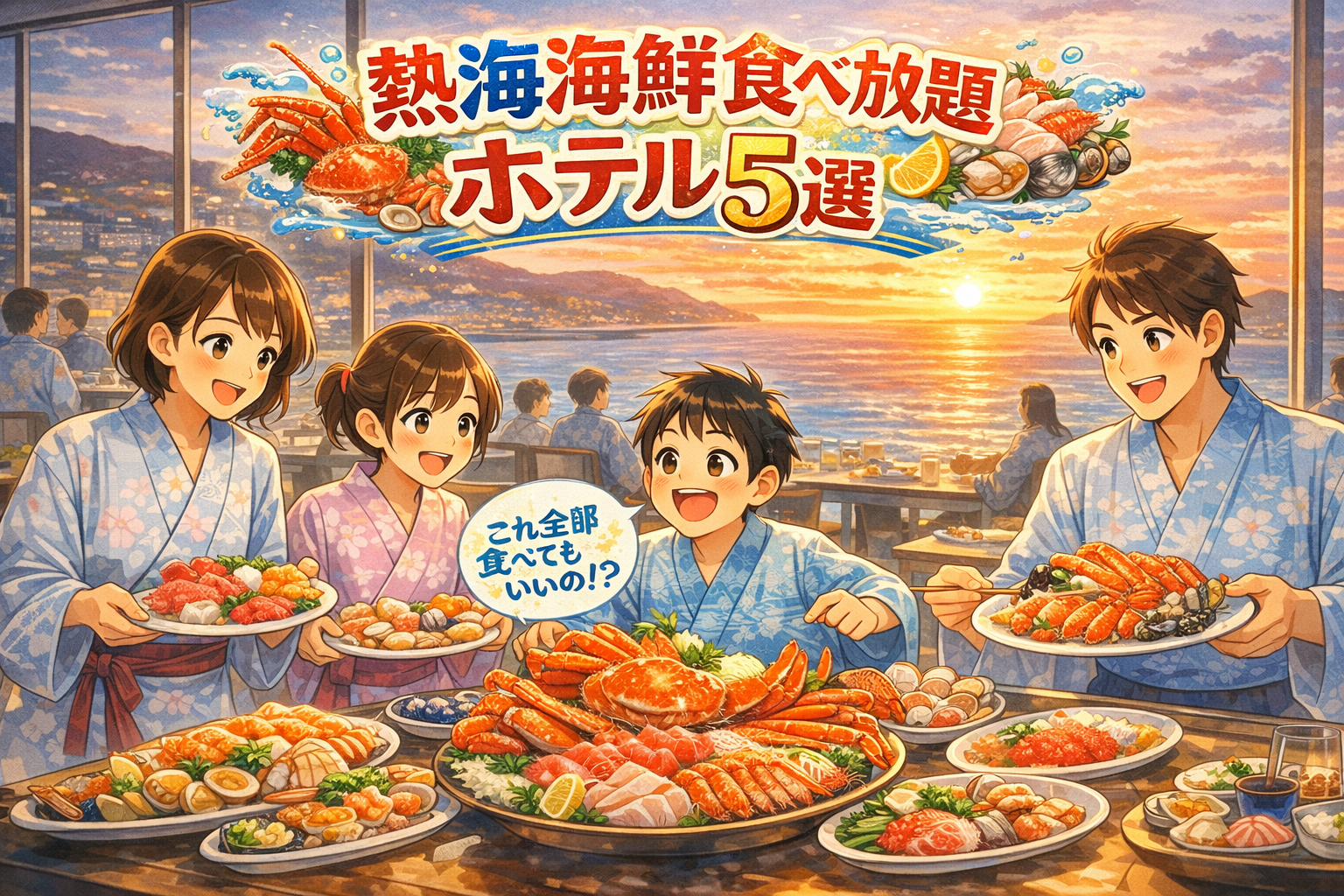 - 景色や温泉と合わせて楽しむなら:ホテル水葉亭・ホテルニューアカオ(こちらも海鮮ビュッフェあり)hotel-new-akao.com